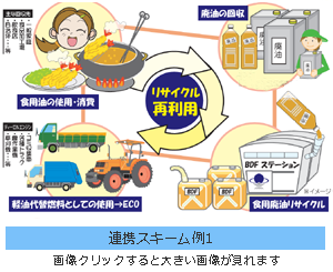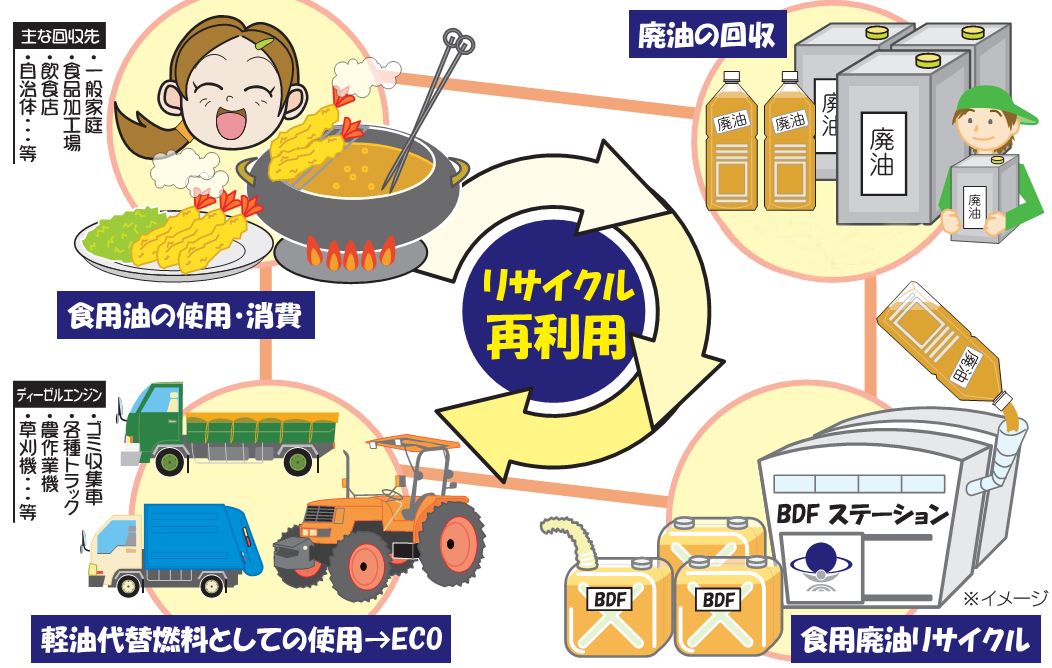 地球温暖化防止、環境保全、食品リサイクルの点から食用廃油の資源化を行う事を目的として、大手スーパーや食品製造、食品加工工場、給食調理場、ご家庭などから廃食用油を回収リサイクルし、各提携企業様で使用される輸送用車両や建設機械などの燃料としてリサイクル循環しています。