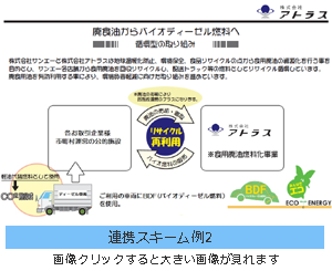 環境問題に取組む企業様と株式会社アトラスは地球温暖化防止、環境保全、リサイクルの点から食用廃油の資源化を行い、バイオマス由来のバイオディーゼル燃料を車両や建機類で有効利用することにより、環境負荷軽減に向けた取り組みを行っております。